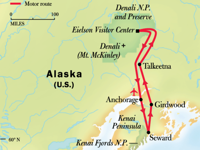 Visit the famed Alaska Sealife Center, an aquarium that collaborates with National Geographic on wildlife initiatives. Board a catamaran for a cruise through Kenai Fjords National Park, where nearly 40 glaciers flow down coastal mountains, forging icy pathways into the sea. Our boat takes us to the exit ramp for one of these massive ice sheets, where we may see—and hear—great chunks of ice fall straight into the water. Kenai is also a wildlife-lover’s paradise, home to orcas and humpbacks, puffins, porpoises, and much more. Enjoy lunch on board.
