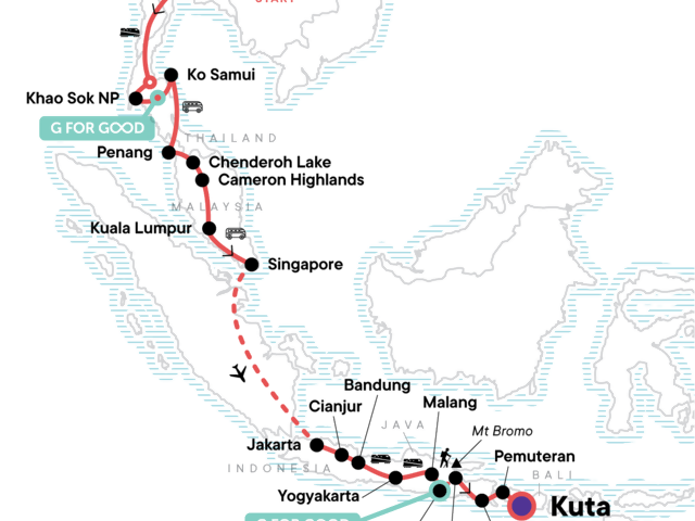 Your Big Night Out Moment: Kuta Dance Party, Kuta. Ang Thong National Marine Park Visit. Orientation walks in Cameron Highlands and Bandung. Entrance to Bromo Tengger Semeru NP. Mt Bromo crater walk. Sunrise hike to Mt Bromo viewpoint. Street food crawls. Internal flight. All transport between destinations and to/from included activities.
