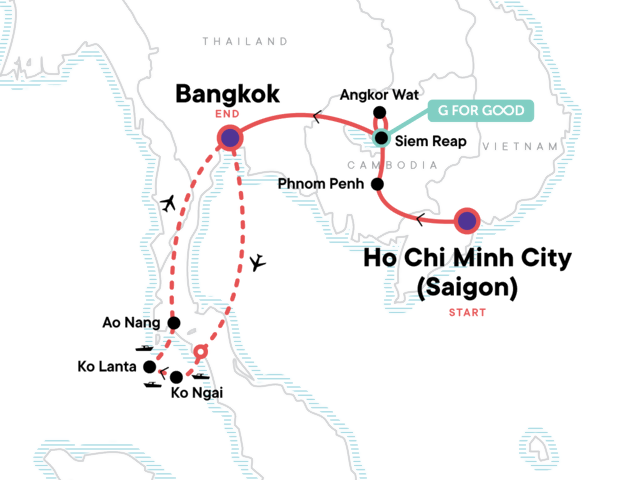 Your Discover Moment: Bangkok. Day Trip to Mekong Delta. Phnom Penh Cyclo Tour. Phnom Penh Guided Tour. Choeung Ek (Killing Fields) Guided Tour. Tuol Sleng Museum (S-21 Prison) Guided Tour. Angkor Wat Guided Tour. Snorkelling Excursion. Trang Islands. Ko Ngai. Internal flights. All transport between destinations and to/from included activities.
