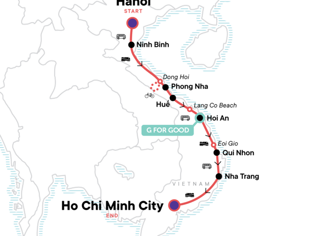 Experience Hanoi's favourite street eats, Wander Dong Hoi wet/fish market with a Banh Mi Breakfast in hand, Descend into the less-visited Vinh Moc Tunnels, Free time to hike in Ninh Binh and explore caves in Phong Nha, Hit the beach in Qui Nhon and join the party in Nha Trang, Immerse into Ho Chi Minh City at a karaoke bar
