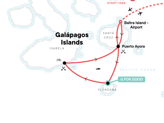 Your G for Good Moment: Floreana Community Guesthouse, Floreana Island. Visit to the Charles Darwin Research Station (Santa Cruz Island). Highlands and wild tortoise excursion. Kayak and snorkel excursion. Snorkelling at Black Beach and Loberia (Floreana Island). Biking excursion (Isabela Island). Sierra Negra Volcano hike. Giant Tortoise Breeding Centre visit. Isabela Municipal Tax. Internal flights. All transport between destinations and to/from included activities.