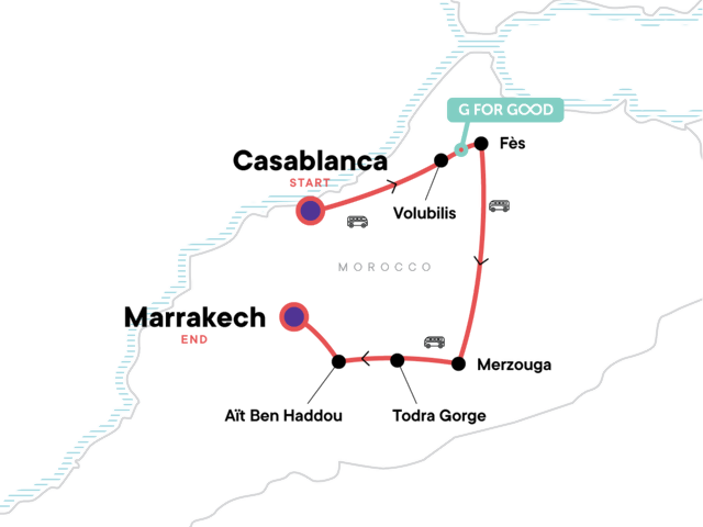 Your Welcome Moment: Welcome Moment - Meet Your CEO and Group. Volubilis guided tour including visit to the Roman ruins. Fès medina guided tour including artisans' quarter and Fès tannery. Sunset camel ride in the desert. Todra Gorge stay with walk through local villages. Aït Ben Haddou kasbah tour. Marrakech medina guided walk including Saadian Tombs, Bahia Palace, souks and Jemaa el-Fnaa square. All transport between destinations and to/from included activities.
