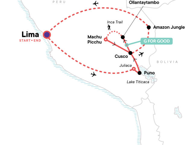 Your Discover Moment: Cusco. Floating islands of Uros visit. Lake Titicaca guided tour. Sacred Valley guided tour. Pottery making demonstration. Inca Trail guided hike with cooks and porters (4 days). Machu Picchu guided tour. Amazon Jungle stay at the exclusive G Lodge Amazon (3 days). Guided excursions with naturalists. Rubber boot use. Internal flights. All transport between destinations and to/from included activities.